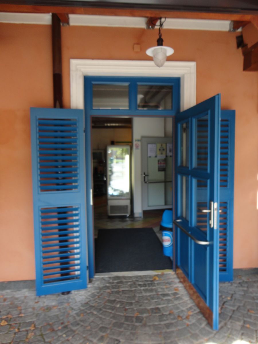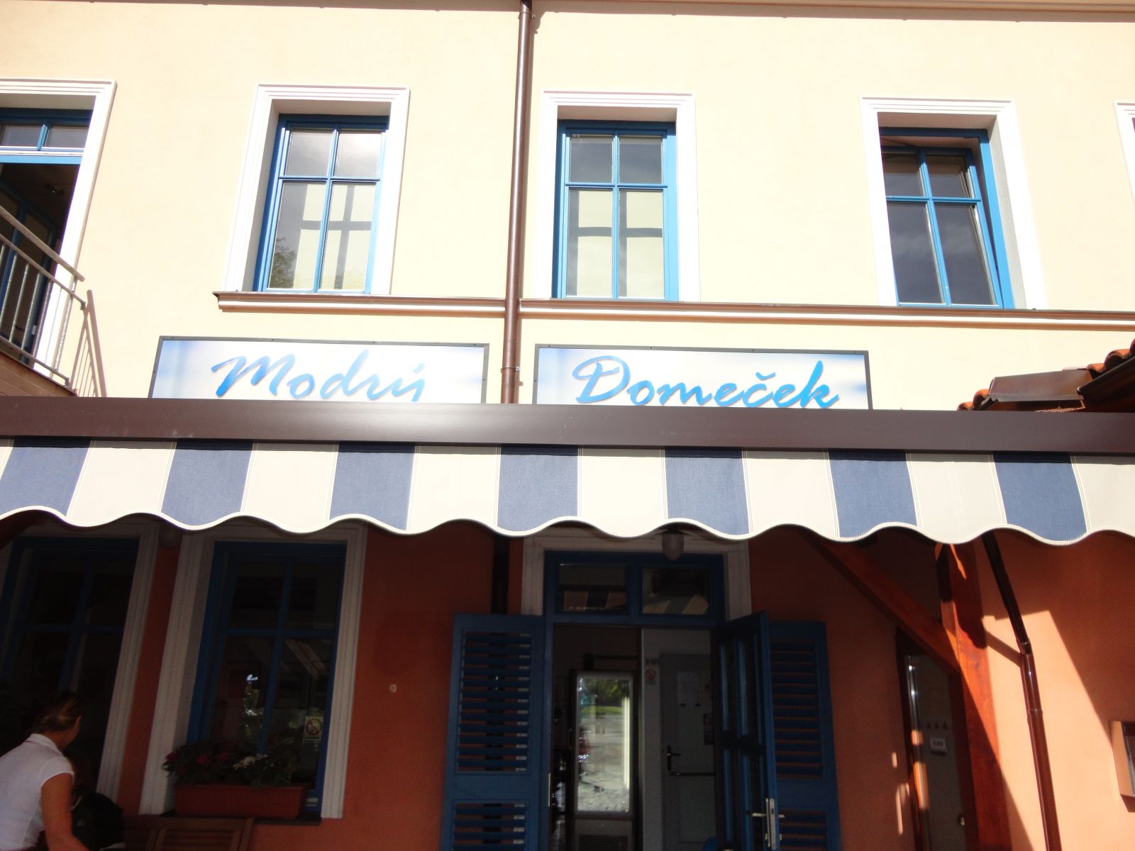 Činnosti na projektu: odstranění stávajícího ocelového schodiště, nová stříška nad vstupem, výsuvná markýza, fasádní nátěr části domu, 4 „firemní“ vývěsní nápisy (modrý,domeček,restaurace,kavárna), vývěsní štít, výměna vstupních dveří, elektroinstalace, jeden elektrický zářič, lavice s odkládací plochou, stavební práce