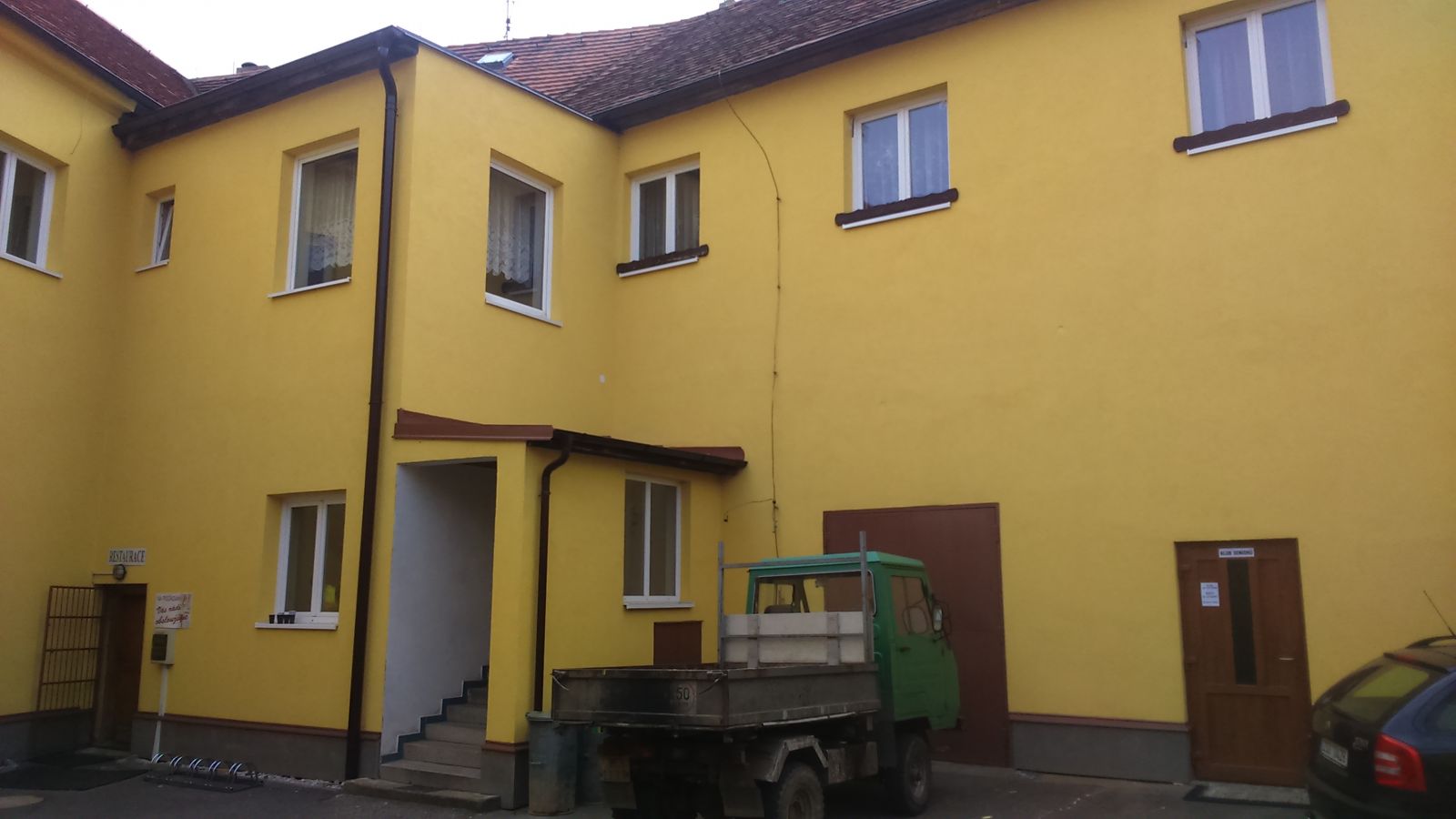 Činnosti na projektu: výměna garážových vrat (3 ks), výměna vchodových dveří (2 ks), oprava fasády (450 m2), okapy a svody (70 m)
